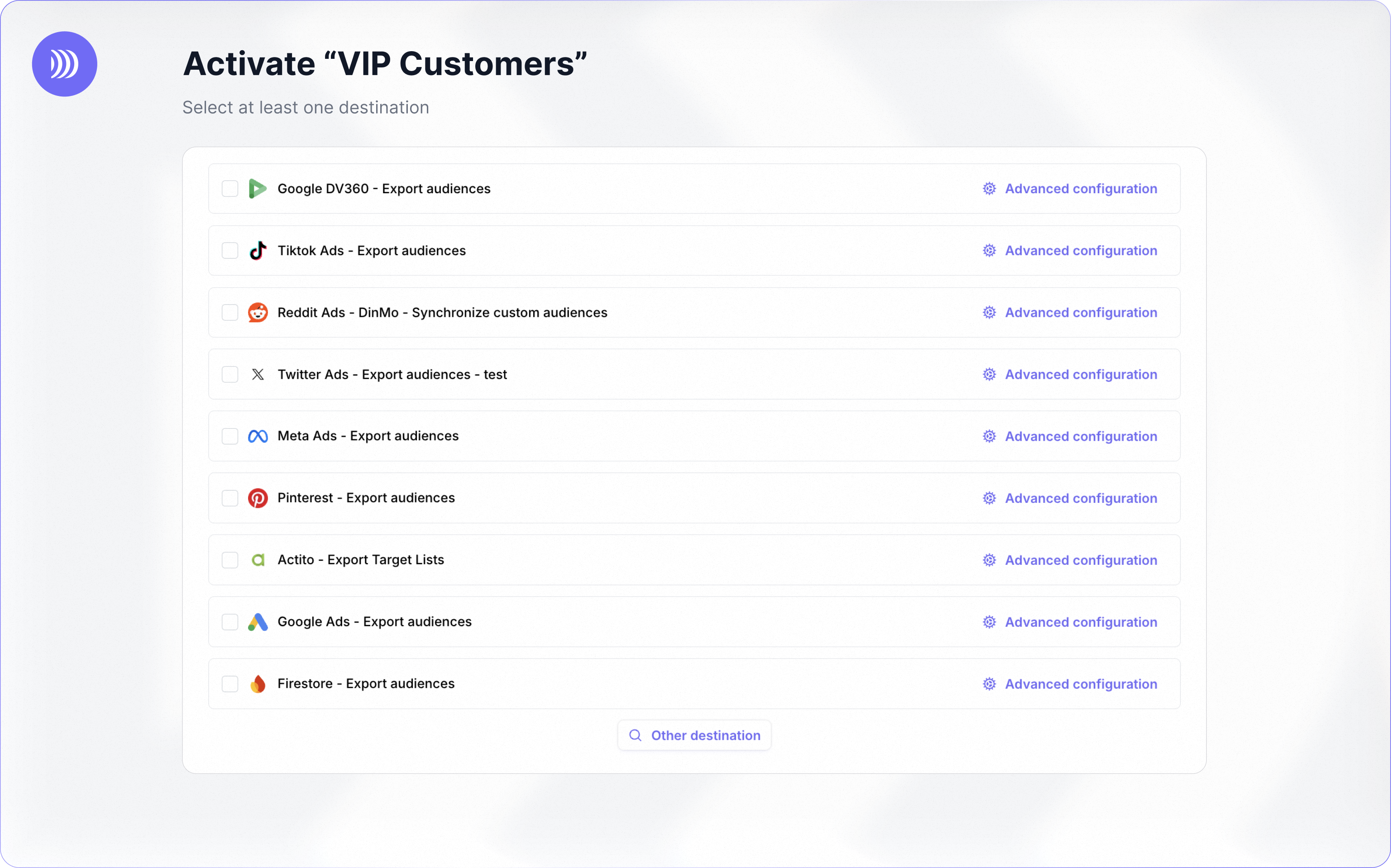 Synchronise your enriched segments to your activation tools: email platform, marketing automation suite, advertising networks (Meta, Google), CRM, messaging tools. Ensure consistency of messages across channels to deliver a seamless experience to your consumers, whether they interact via your app, website, store or advertising campaigns.