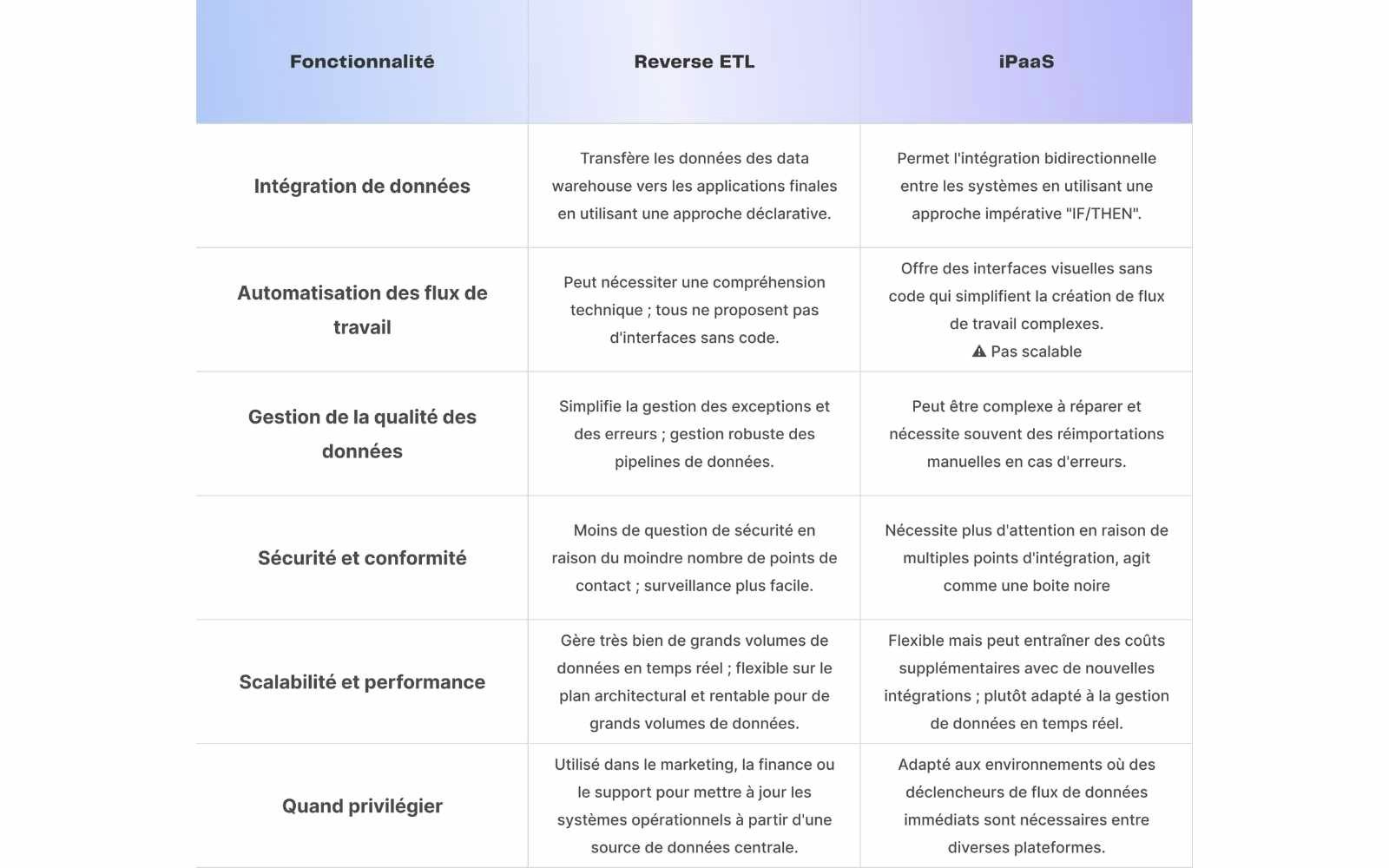 Table de comparaison : Reverse ETL vs. iPaaS